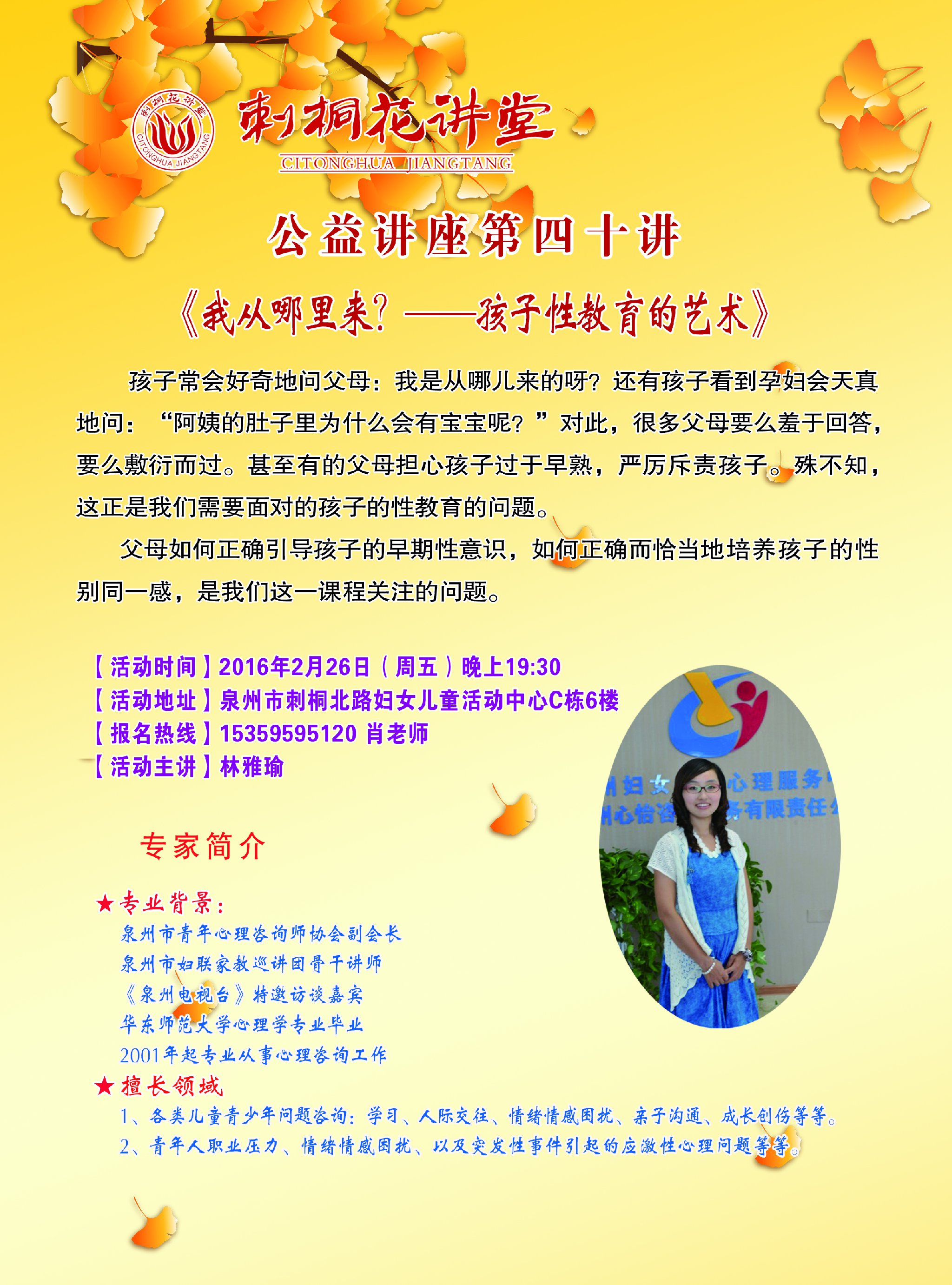 刺桐花讲堂公益讲座第四十讲《我从哪里来?——孩子性教育的艺术