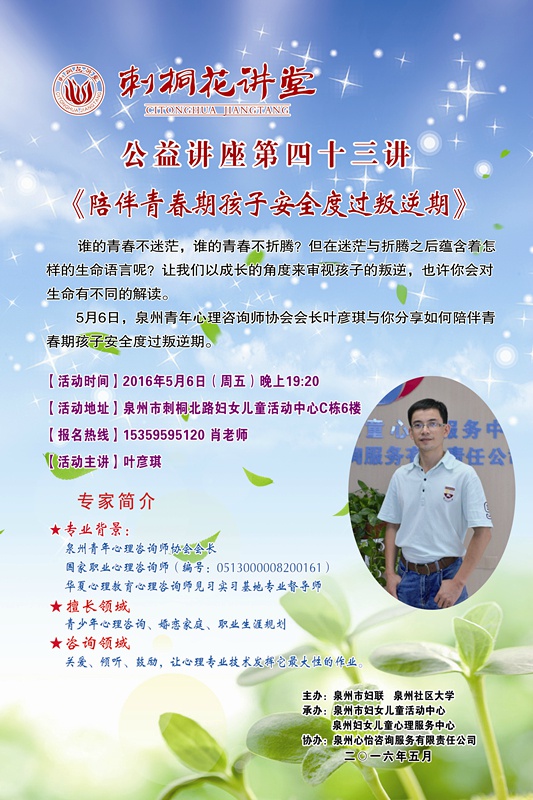 刺桐花讲堂公益讲座第四十三讲 《陪伴青春期孩子安全度过叛逆期