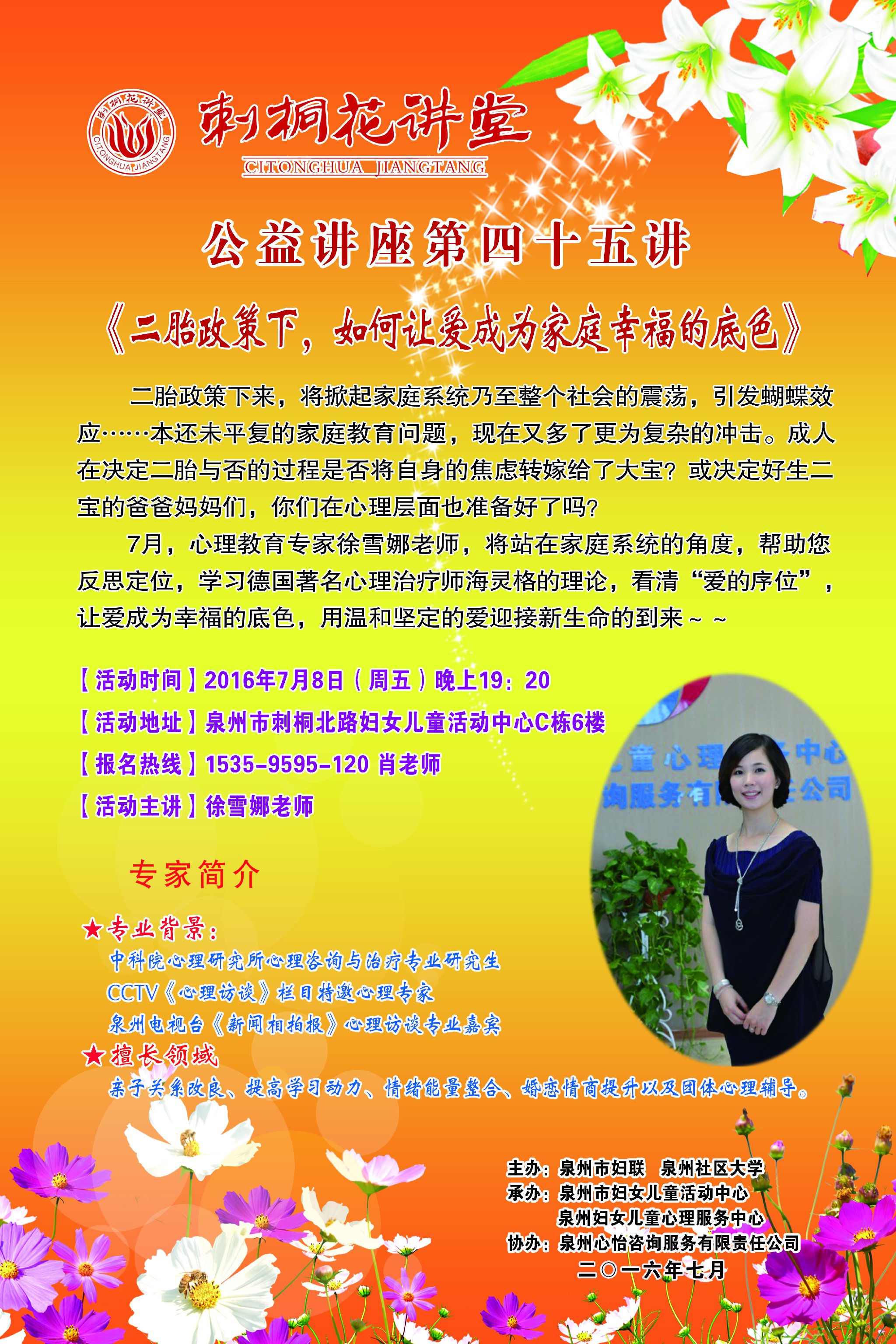 刺桐花讲堂 公益讲座第四十五讲 《二胎政策下,如何让爱成为家庭