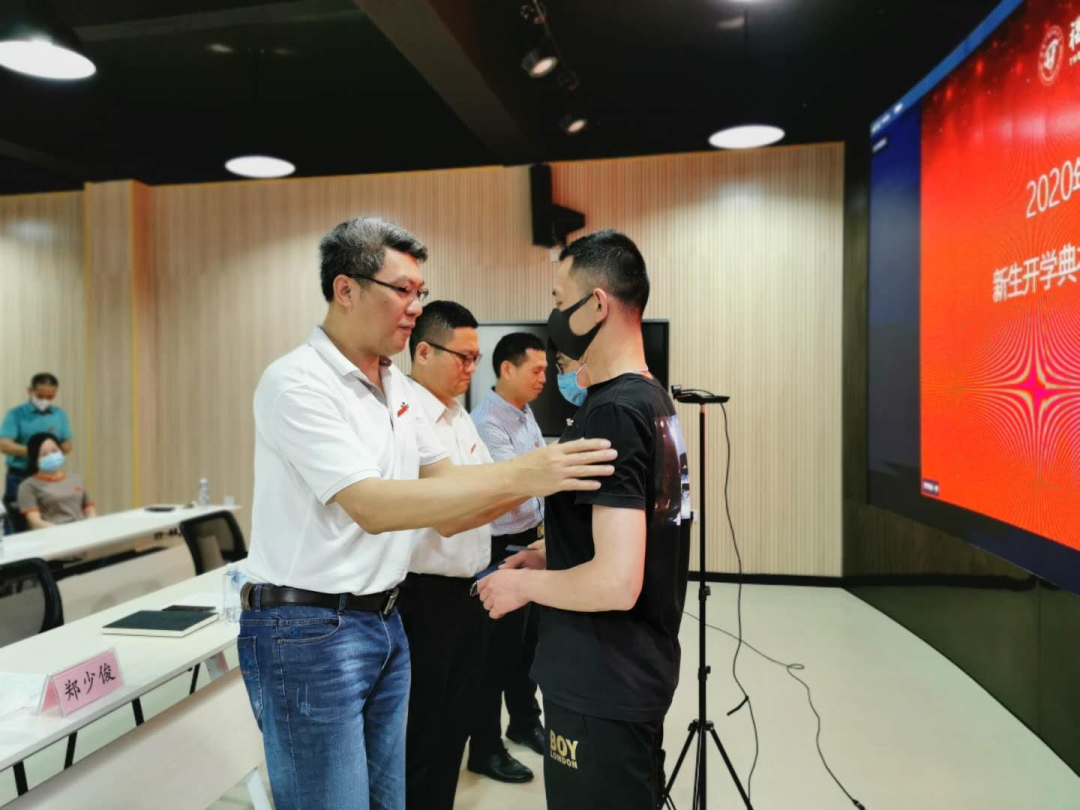 陈向荣书记(校长)(中)、郑少俊副书记(左)和林春成副校长(右)为新生代表佩带校徽