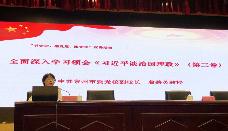 泉州市委党校副校长、詹碧英教授围绕“全面深入学习领会《习近平谈治国理政》第三卷”开展讲座,强调当前历史背景下,中国在崛起,要有高度的政治站位,要有国际眼光、国际视野,要深入学习领会习近平新时代中国特色社会主义思想的核心要义,推动学习贯彻往深里走、往实里走、往心里走。