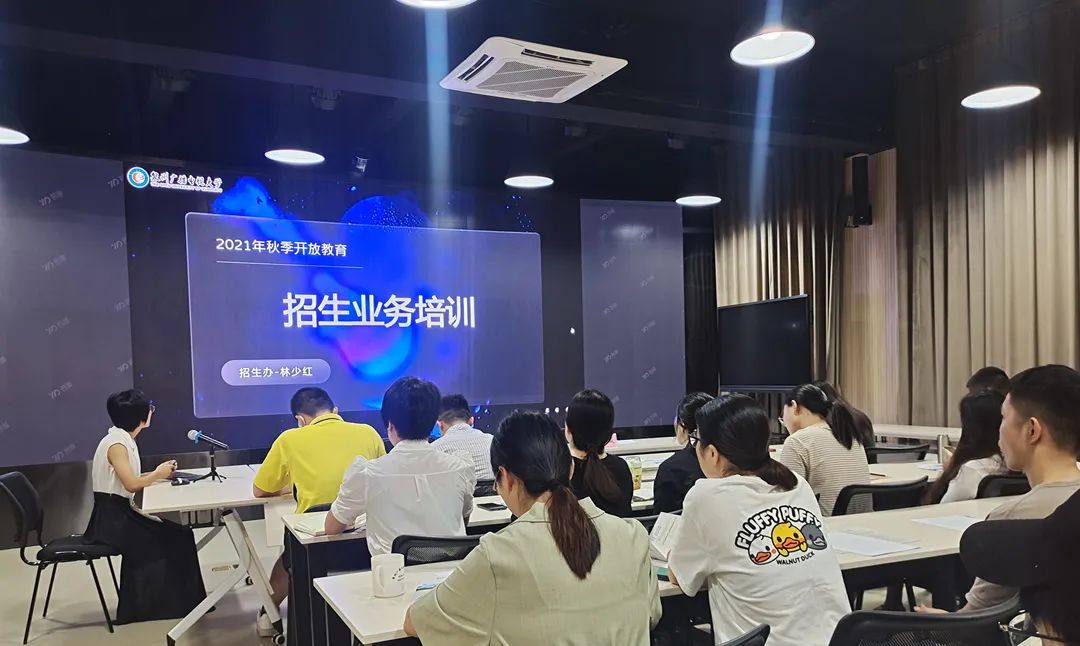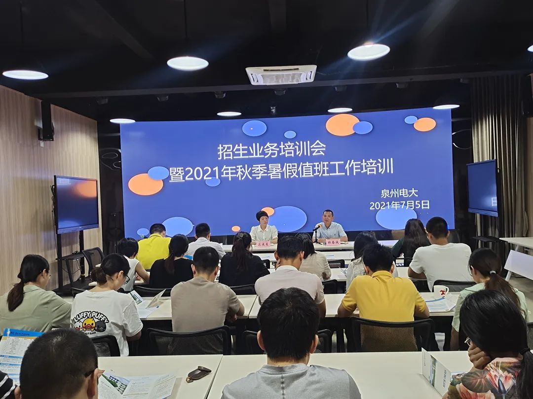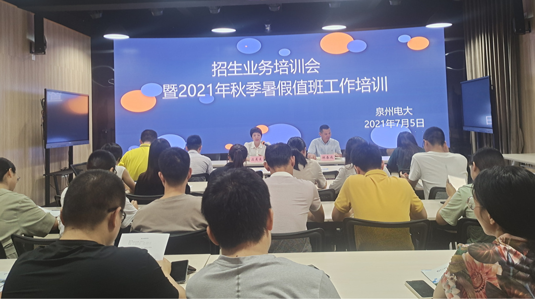 今天上午9:00,泉州电大举办招生业务培训会暨2021年秋季暑假值班工作培训,林春成副校长出席会议,40周岁以下的青年教师参加会议,会议由招生办负责人庄美美主持。 会议伊始,林副校长对青年教师提出了三点工作要求。一是熟知招生政策,拓宽招生渠道;二是讲好电大故事,加大宣传力度;三是坚守岗位职责,做好服务工作。 林春成副校长讲话 随后,招生办林少红老师从学校简介、开放教育学历介绍、2021年秋招政策、暑假值班要求这四个方面向青年教师进行招生业务培训。 林少红老师进行招生业务培训 最后,招生办负责人庄美美分享了其他优秀老师的招生经验、解答了教师在招生过程中存在的疑问与困难,并做了最后总结。 招生办负责人庄美美做最后总结 本次会议是对往年招生工作的一次经验交流,也是对2021年秋季招生工作的动员和展望。通过此次会议,青年教师进一步熟知了招生政策、拓宽了招生思路、提升了业务能力,为做好2021年秋季招生工作奠定了良好的基础。