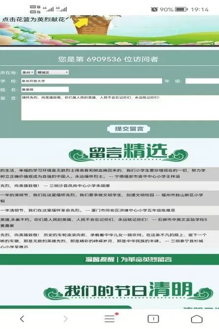 “又是一年春草绿,又到一年清明时” 我们不会忘记 战火之中,无数革命先烈 抛头颅、洒热血 换来今天的岁月静好 我们不会忘记 疫情之下,无数抗“疫”英雄 独忘我、只奉献 守护家园的幸福安康 在清明节之际,为深化文明单位创建,弘扬和践行社会主义核心价值观,传承爱国、孝敬等中华民族传统美德,缅怀先烈、先贤,推进移风易俗、倡导时代新风,树立文明、绿色、低碳的祭扫新风尚,同心抗疫、共克难关,泉州开放大学以“我们的节日·清明”暨“网上祭英烈”为主题,组织党员干部、广大师生开展“网上祭英烈”活动,缅怀先烈,致敬英雄,弘扬英烈精神,传承红色基因。 在线瞻仰缅怀 学习英雄事迹 云端献花鞠躬 致敬英烈先辈 网上留言寄语 不忘家国情怀 结合做好疫情防控,学校党员干部、教职工们通过线上学习英雄事迹,网上祭奠英烈,云端点烛献花、鞠躬致敬、留言寄语,深切缅怀先烈们的丰功伟绩,传承红色基因,赓续精神血脉,励志奋斗青春,逐梦新征程,建功新时代。 “风景清明后,云山睥睨前” 每一次对历史的回望都是为了新的出发 让红色基因融入血脉 让英烈精神薪火相传 让我们不忘初心、砥砺前行 把革命先烈开创的伟大事业推向前进 让我们携手 一起创造新时代 初审:黄振奋 复审:蔡金铭 终审:郑少俊