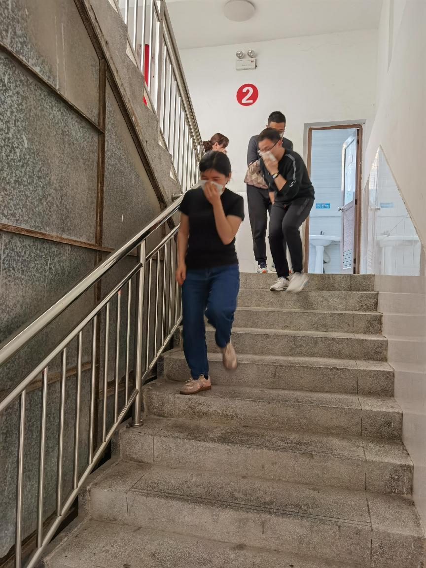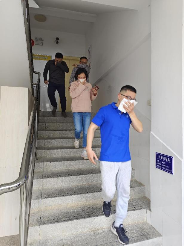 下午15时30分,火灾报警声响起,办公楼人员立即按照疏散逃生预案在各处室主任引导下,用湿毛巾捂住口鼻,弯着腰贴着墙有序地从最近的楼梯依次、快速的,短时间内疏散到安全避险地点。