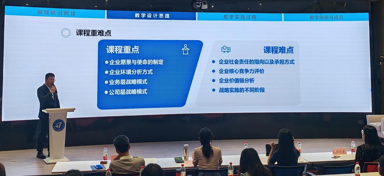 然后参赛获奖教师进行经验分享,公管组江山老师介绍了自己教学设计方案的高分小窍门,完整的教学过程、详实的论证材料、多元的佐证资料都是得分小妙招,同时也指出自己在比赛过程中的不足,如教学过于着眼评分标准,创新不足等。