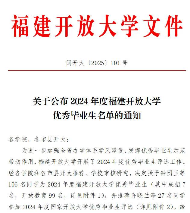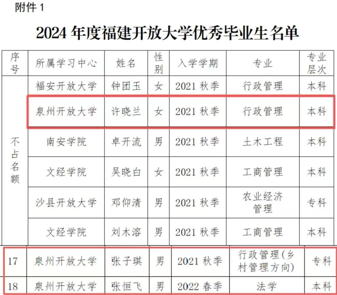 喜报来啦!我校许晓兰、张恒飞、张子琪3名学子获得“2024年度福建开放大学优秀毕业生”荣誉称号